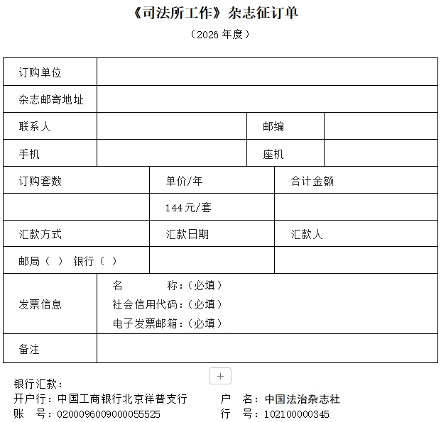 ★ 若不能進(jìn)行在線提交訂單,請(qǐng)將本征訂單填寫完整后與匯款憑證一并發(fā)郵件至sfsgzfxb@moj.gov.cn或添加微信13681283507/13681570831后發(fā)送電子版征訂單與匯款憑證。