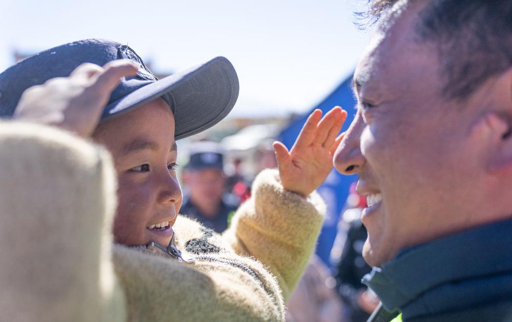 2025年1月14日,在受到地震波及的西藏定日縣長所鄉(xiāng)嘎布村,一名小朋友戴上了參加抗震救災(zāi)工作的移民警察米瑪次仁的帽子,向他敬禮。新華社記者 丁增尼達(dá) 攝