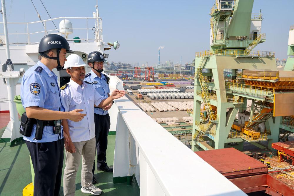 2025年10月1日,在山東港口日照港,日照出入境邊防檢查站民警登上外輪與外籍船長(中)交流。新華社記者 郭緒雷 攝
