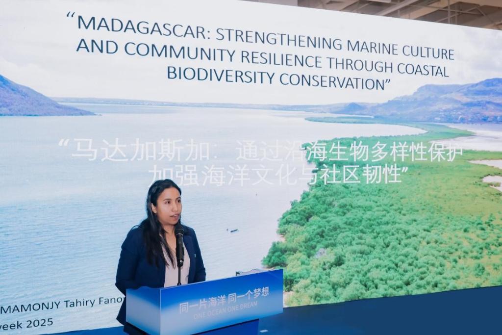 2025年10月29日,馬達加斯加環(huán)境與可持續(xù)發(fā)展部官員塔希里·拉庫圖馬蒙吉在2025中國海洋經(jīng)濟博覽會活動中發(fā)言。(國際紅樹林中心供圖)