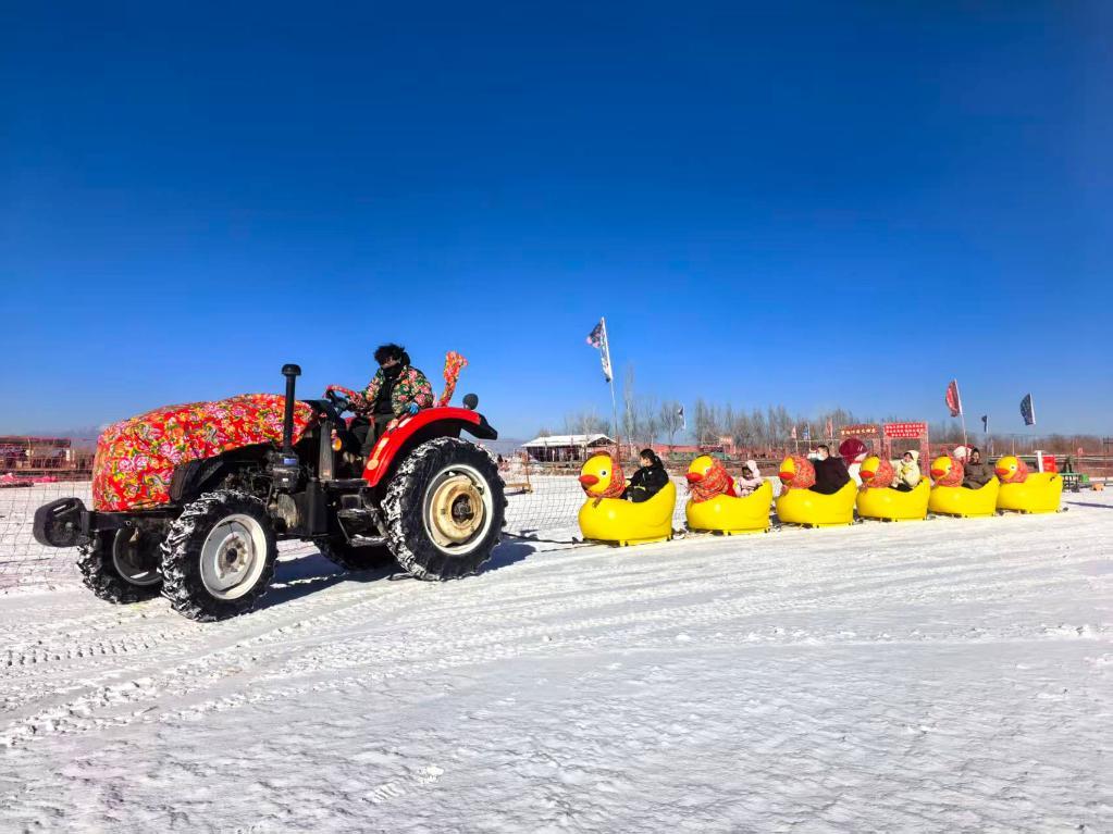 1月10日,游客在四十里店村的稻漁空間體驗冰雪游樂項目。新華社記者馬麗娟 攝