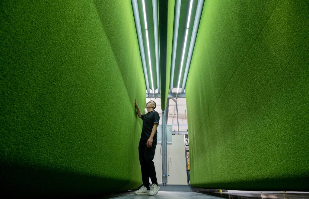 在山東省樂陵市泰山體育產(chǎn)業(yè)集團(tuán)人造草坪智能化生產(chǎn)車間,工人在檢測產(chǎn)品。新華社記者 范長國 攝