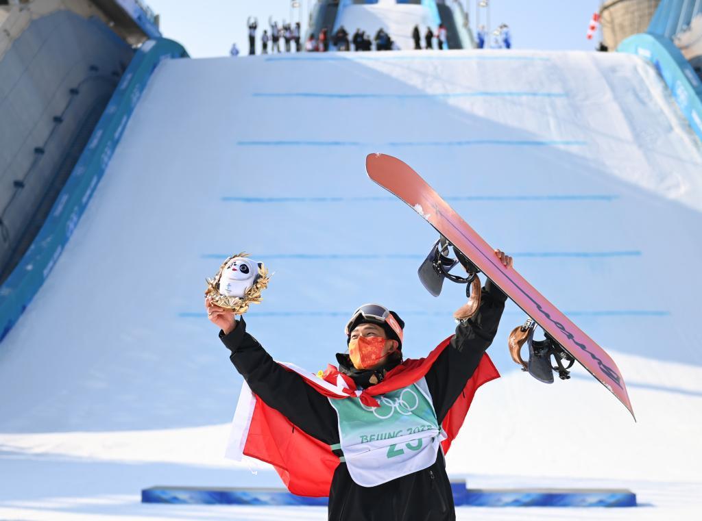2022年2月15日,中國(guó)選手蘇翊鳴在奪得北京冬奧會(huì)單板滑雪男子大跳臺(tái)冠軍后慶祝。新華社記者 黃宗治 攝