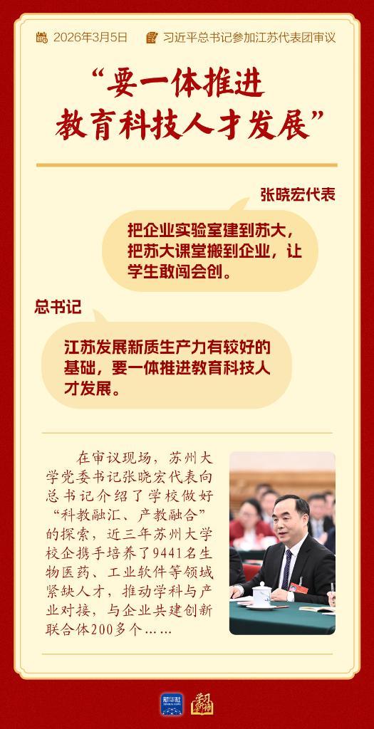 張曉宏代表來自蘇州大學,向總書記介紹了學校推進“科教融匯、產(chǎn)教融合”的探索:“把企業(yè)實驗室建到蘇大,把蘇大課堂搬到企業(yè),讓學生敢闖會創(chuàng)?!苯晷F髷y手培養(yǎng)了9441名生物醫(yī)藥、工業(yè)軟件等領域緊缺人才,推動學科與產(chǎn)業(yè)對接,與企業(yè)共建創(chuàng)新聯(lián)合體200多個……