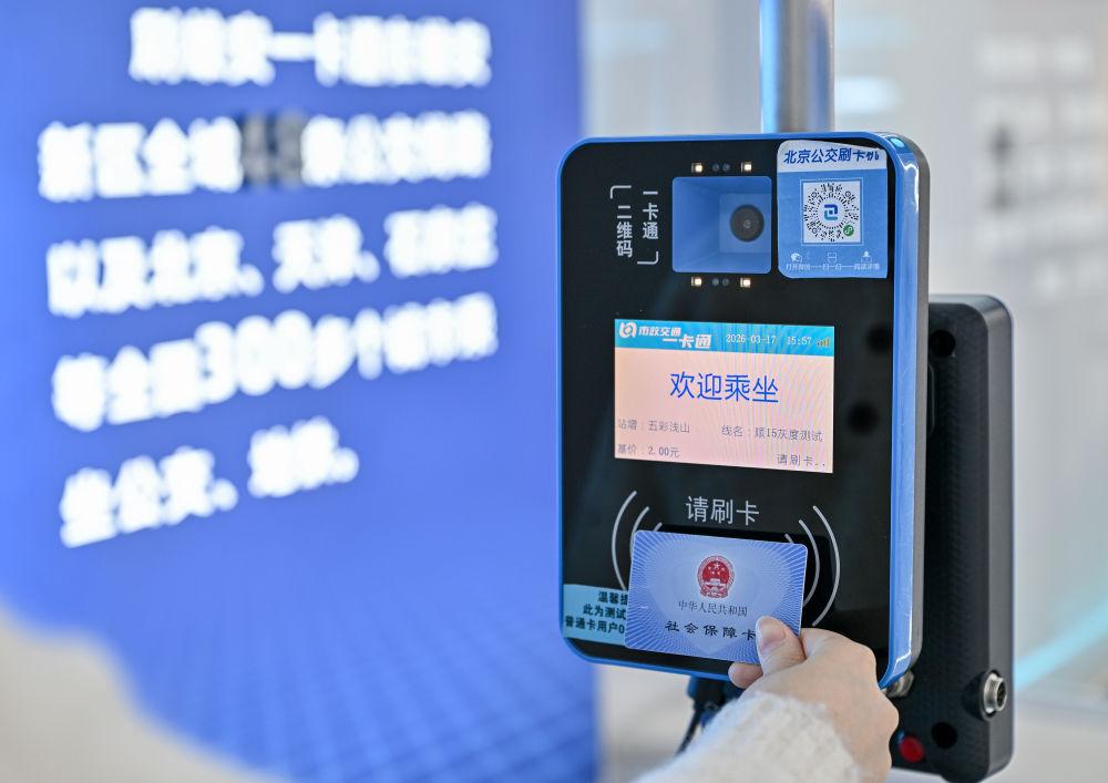 2026年3月17日,雄安一卡通體驗館的工作人員演示刷社??ǔ俗卉嚒?/span>