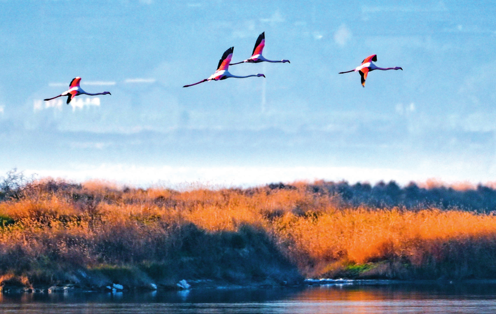 火烈鳥在山西省運城鹽湖濕地飛翔(2025年11月19日攝)新華社發(fā)(薛俊攝)