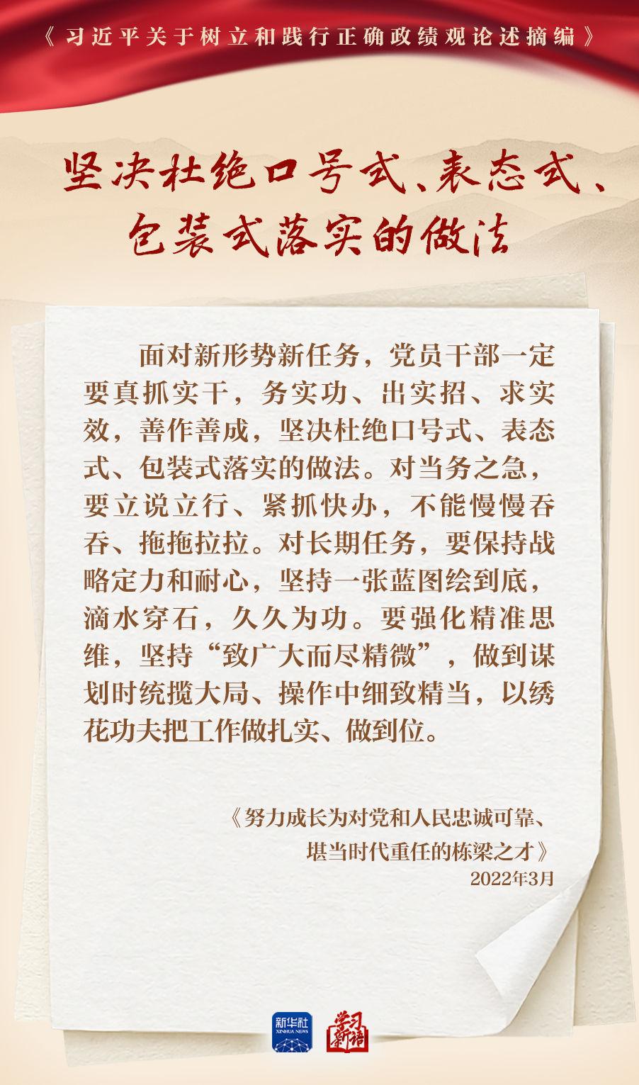 樹(shù)立和踐行正確政績(jī)觀學(xué)習(xí)教育正在全黨開(kāi)展。真抓實(shí)干,是共產(chǎn)黨人的鮮明品格,也是成事之道。我們選取《習(xí)近平關(guān)于樹(shù)立和踐行正確政績(jī)觀論述摘編》一書(shū)中的相關(guān)重要論述,一起學(xué)習(xí)領(lǐng)會(huì)。