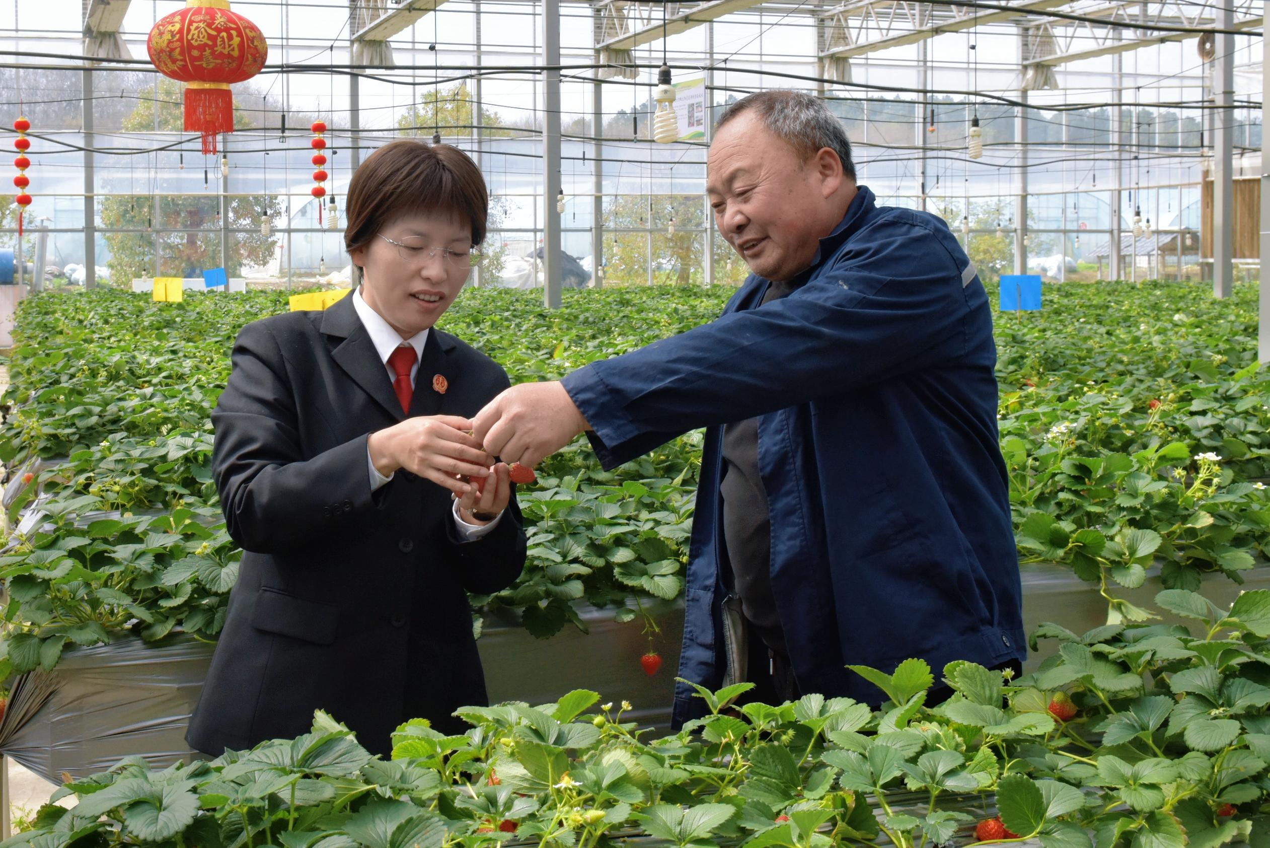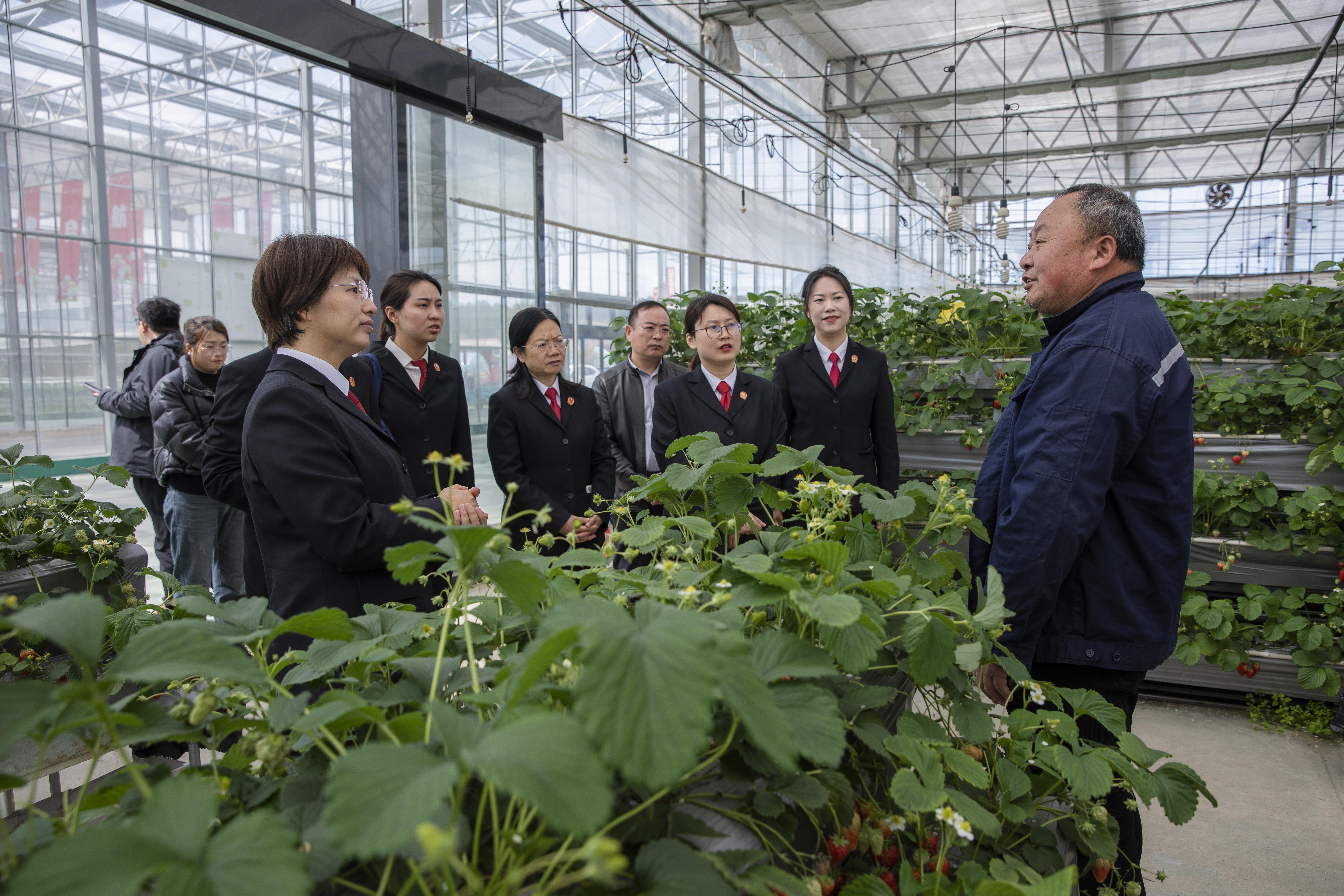 調(diào)研組一行首先走進白兔鎮(zhèn)草莓種植基地,實地察看智能草莓大棚的種植培育情況。江蘇省勞動模范、草莓種植大戶王伯生詳細介紹了大棚草莓的年產(chǎn)量、品種培育、市場銷售等產(chǎn)業(yè)發(fā)展現(xiàn)狀。草莓專業(yè)合作聯(lián)社負責人劉漢卿結(jié)合經(jīng)營實際,講述了在“莓好白兔”品牌創(chuàng)建、商標使用、市場維權(quán)等過程中遇到的難點問題,為司法調(diào)研提供了一線實踐素材。調(diào)研組認真傾聽記錄,與種植戶、合作社負責人深入交流,細致了解產(chǎn)業(yè)發(fā)展中的司法需求。