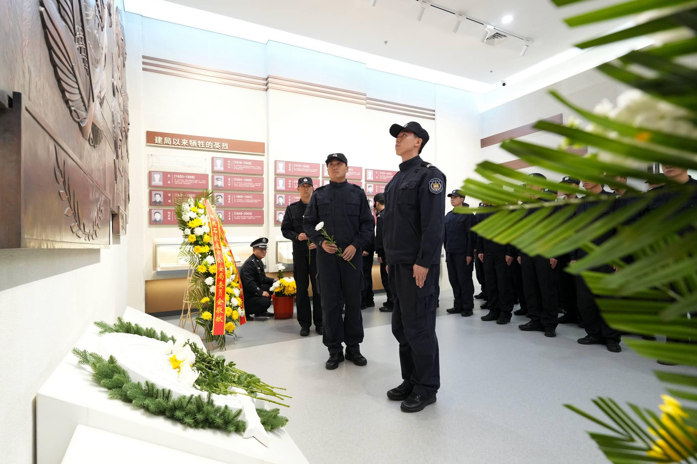 圖為民警依次向公安英烈敬獻(xiàn)鮮花。