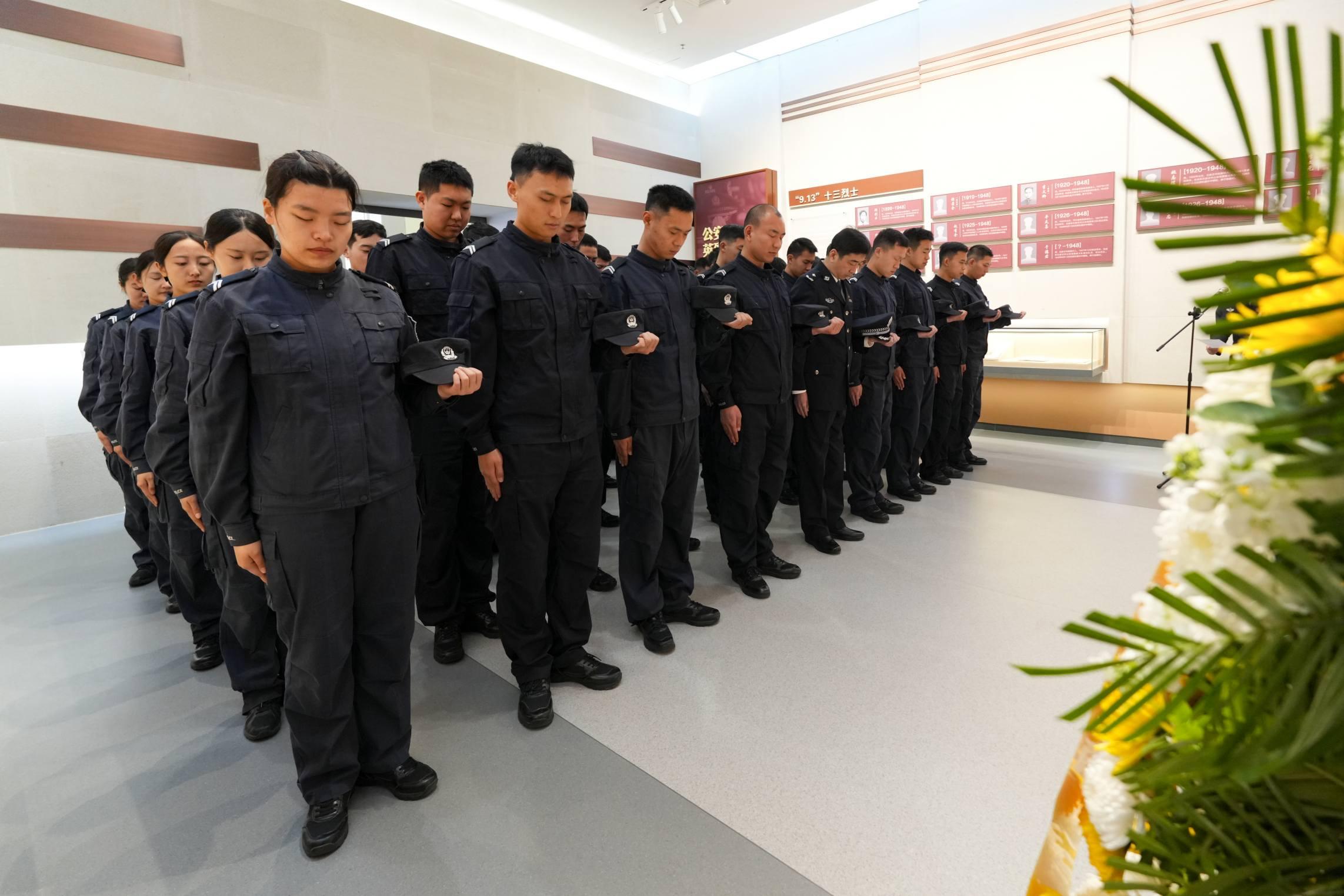 圖為民警脫帽肅立向公安英烈默哀致敬。