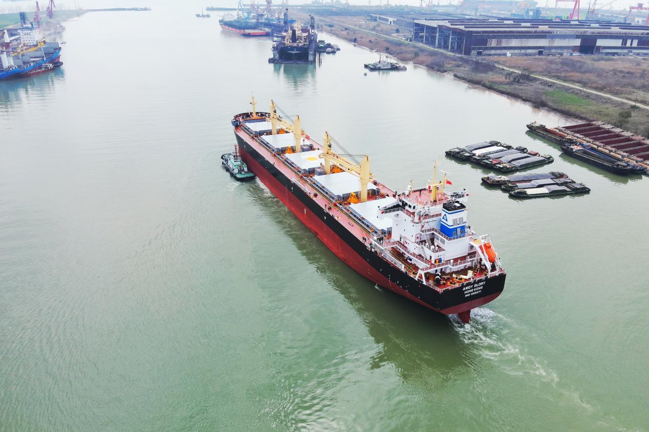 “這艘廈門榮耀輪,是我們本季度交付的第4艘貨輪,目前公司有6條散貨船正在建造過(guò)程中,按照全年的計(jì)劃今年將交付19艘貨船,共計(jì)110萬(wàn)載重噸?!苯K海通海洋工程裝備有限公司行政部部長(zhǎng)顧軍說(shuō)。