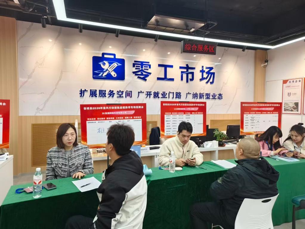 回遷居民在容東零工市場(chǎng)舉辦的專場(chǎng)招聘會(huì)上咨詢崗位情況(2026年3月攝)。(受訪者供圖)