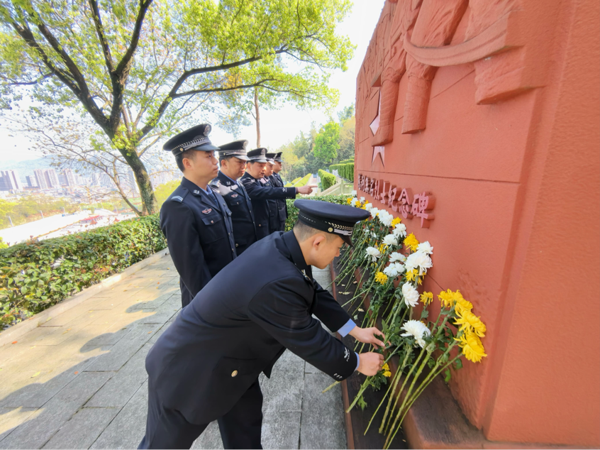 在烈士紀念碑前,民警警容嚴整、列隊肅立,向革命先烈敬禮,表達崇高敬意。民警們依次上前敬獻鮮花,圍繞紀念碑緩步繞行一周,瞻仰碑文、追憶英烈事跡。隨后全體民警默哀、三鞠躬,緬懷革命烈士。