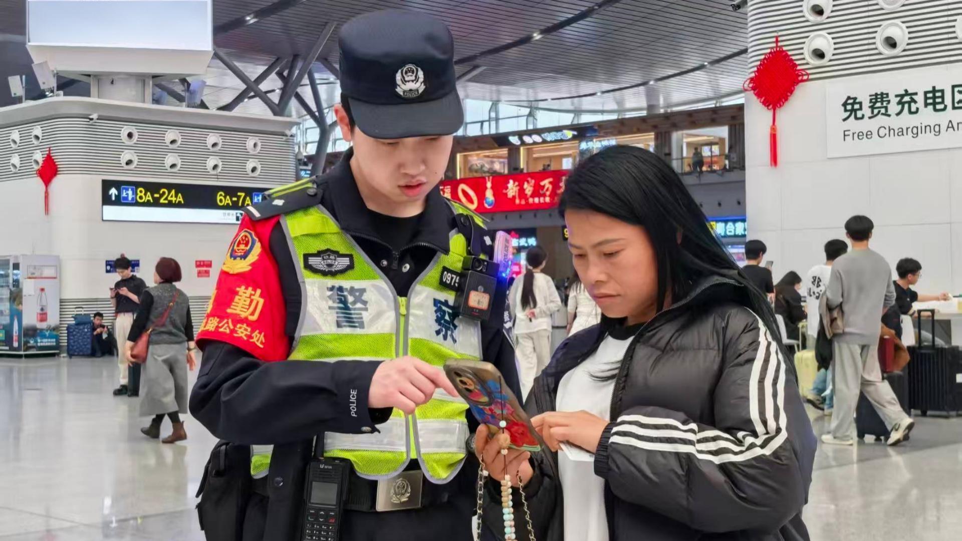 假期安保期間,派出所民警在堅守崗位的同時,始終秉持為民服務(wù)宗旨,主動為旅客排憂解難,用暖心舉動傳遞公安溫度。4月4日,民警劉鈺慧在執(zhí)勤時,接到一名外籍旅客的緊急求助,該旅客因手機(jī)遺失焦急萬分。經(jīng)簡單交流得知,旅客乘坐網(wǎng)約車抵達(dá)長沙南站后,不慎將一部存有大量工作資料和個人信息的手機(jī)遺落在網(wǎng)約車座位上,手機(jī)內(nèi)重要數(shù)據(jù)的丟失讓他手足無措。