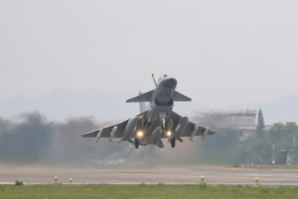 2023年4月8日,東部戰(zhàn)區(qū)圓滿完成環(huán)臺島戰(zhàn)備警巡和“聯(lián)合利劍”演習(xí)。這是殲擊機掛彈起飛。新華社發(fā)(王紫簫 攝)