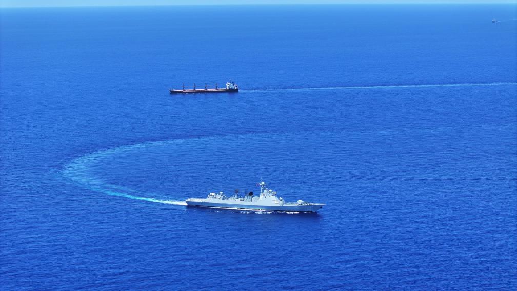 中國海軍第46批護(hù)航編隊焦作艦(下)護(hù)送貨船至解護(hù)點后與之分航(2024年5月7日攝)。新華社發(fā)(張大禹 攝)