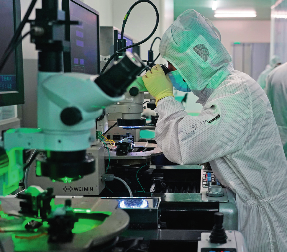 在位于江西省南昌市的南昌大學國家硅基LED工程技術研究中心,技術人員正在對芯片進行電性測試(2024年4月3日攝)。萬象攝/本刊