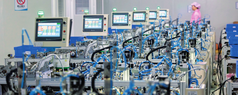 在江西贛州訊康電子科技有限公司,工作人員從T1—T2全自動穿環(huán)機旁走過,該機器生產(chǎn)磁性元器件(資料照片)。才揚攝/本刊