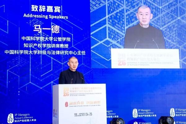 1月24日至25日,2026年知識產權戰(zhàn)略發(fā)展新年論壇暨知識產權經理人年會在北京舉行。在開幕式上,中國科學院大學公共政策與管理學院、知識產權學院講席教授、中國科學院大學科技與法律研究中心主任馬一德發(fā)表致辭。他在回顧并反思知識產權學科與制度所面臨的深刻挑戰(zhàn)后,呼吁當代中國知識產權人努力繼承和發(fā)揚中國知識產權學科奠基人劉春田教授的擔當精神、學術風骨與責任意識。