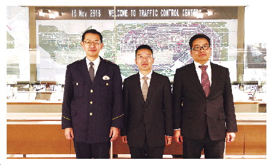 圖為本報記者蒲建安(中)在日本東京交通管制中心采訪,了解東京治理交通擁堵的對策。