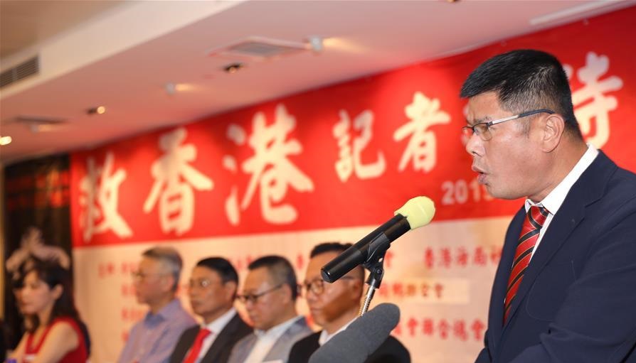 8月15日,香港福建社團(tuán)聯(lián)會(huì)副主席蔡建四在會(huì)上宣讀這些社團(tuán)發(fā)表的聯(lián)署聲明《反暴力 救香港》。 新華社記者 吳曉初 攝