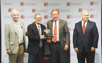 圖為6月12日,尼爾·布什(左三)在亞特蘭大為美國前總統(tǒng)卡特頒發(fā)首屆美中關(guān)系卓越領(lǐng)袖獎,其子詹姆斯·卡特(左二)代為領(lǐng)獎。