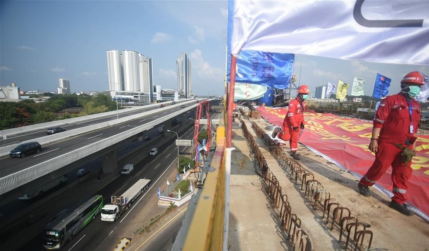 8月15日, 在印度尼西亞勿加泗,工人在印尼雅萬高鐵項目一處連續(xù)梁上行走。 印尼雅萬高鐵項目1號梁場雅加達至萬隆方向架梁通道上的控制性工程-DK29處100米跨剛構連續(xù)梁于15日下午順利合龍,標志著全線首個架梁通道的形成,為首個架梁段連續(xù)架梁創(chuàng)造了條件。 新華社發(fā)(祖卡南攝)