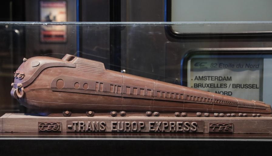 這是12月15日在比利時(shí)布魯塞爾火車世界博物館拍攝的一件藝術(shù)家以全歐快車為原型而創(chuàng)作的巧克力火車雕塑。