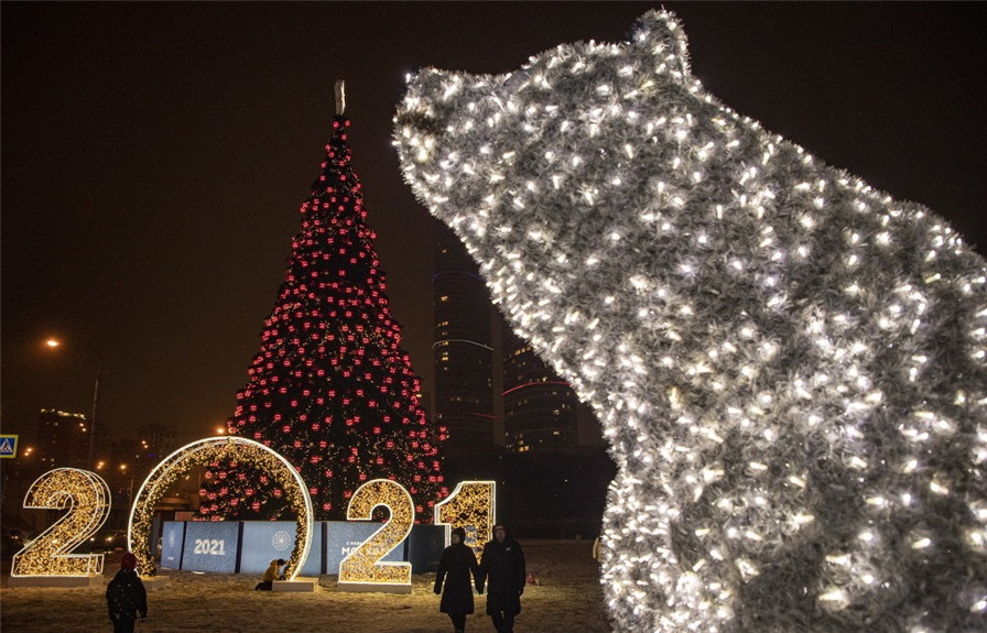 人民網(wǎng)訊 當(dāng)?shù)貢r(shí)間12月15日,俄羅斯莫斯科,北極熊的雕塑亮起彩燈,迎接新年和圣誕。