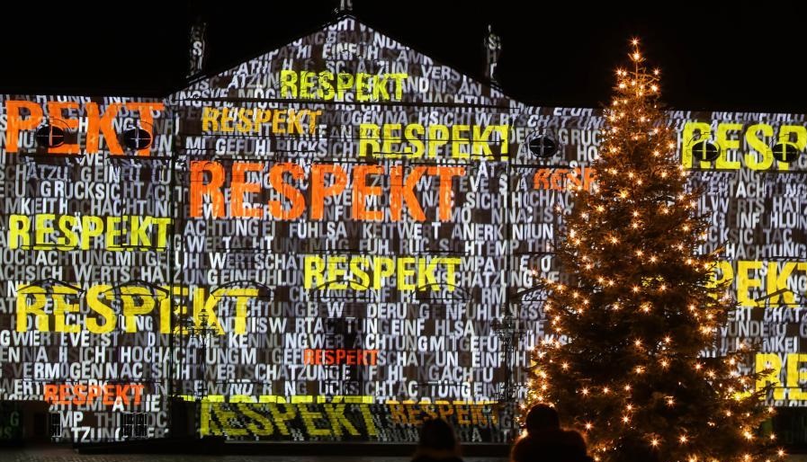 12月17日,在德國首都柏林,兩名參觀者觀看被“尊重”字樣點亮的德國總統(tǒng)府。