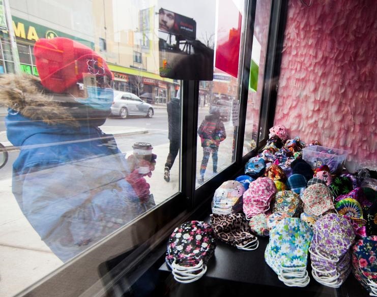 12月19日,在加拿大多倫多,一名戴口罩的男子在一家商店外查看銷售的口罩。