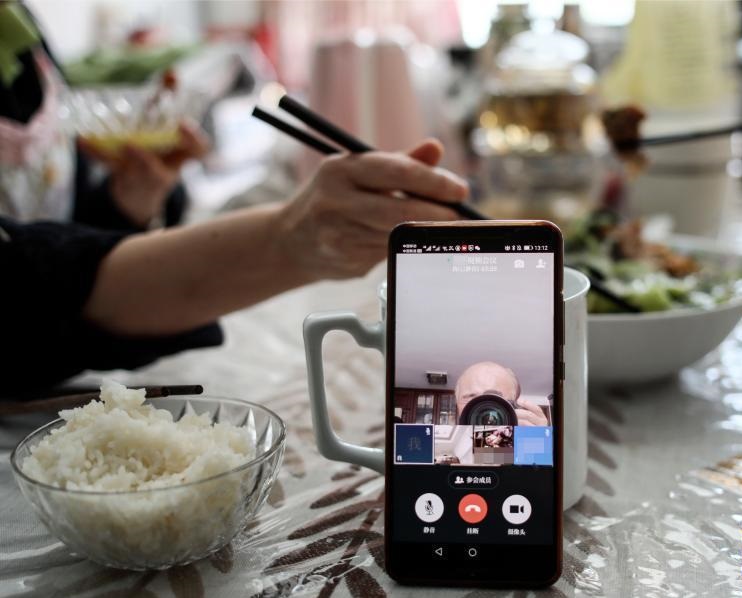 2月17日,一名攝影記者在北京的家中參加線(xiàn)上會(huì)議時(shí)拍攝參會(huì)使用的手機(jī)。新冠疫情暴發(fā)以來(lái),居家辦公、線(xiàn)上會(huì)議成為工作“新常態(tài)”。