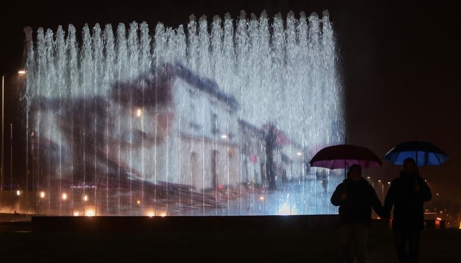 1月2日,在克羅地亞薩格勒布,人們經過投射有遭地震損毀的彼得里尼亞街頭影象的噴泉。新華社發(fā)(馬爾科·普爾皮奇攝)
