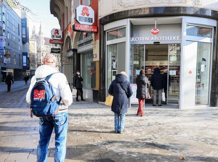 1月15日,在德國慕尼黑,人們排隊(duì)等候進(jìn)入一家藥店。