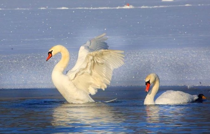 這是1月16日在白俄羅斯首都明斯克拍攝的天鵝。 雖然此時白俄羅斯已是寒冬,但首都明斯克的一處不凍湖仍吸引來一些天鵝到此越冬。 新華社發(fā)(任科夫攝)