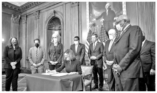 當(dāng)?shù)貢r間1月11日,鑒于6日發(fā)生的國會騷亂事件,眾議院民主黨人正式提交針對特朗普的彈劾條款草案。彈劾條款指控特朗普“煽動叛亂”,要求對其進(jìn)行“彈劾和審判,并免除其總統(tǒng)職務(wù),取消其擁有的相關(guān)榮譽、信用和有酬職位資格”。13日下午,美國國會眾議院兩黨議員經(jīng)過辯論后以232票贊成、197票反對,通過了針對特朗普的彈劾案。眾議院全體民主黨人以及10名共和黨人投了贊成票。