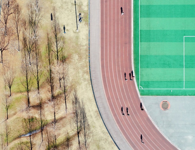 人民網(wǎng)訊 當(dāng)?shù)貢r間1月20日,韓國光州,冬日陽光和煦,航拍韓國全南大學(xué)操場。