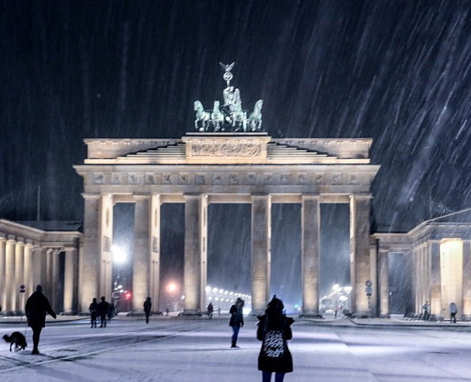 德國柏林大雪紛飛 勃蘭登堡門披“白衣”