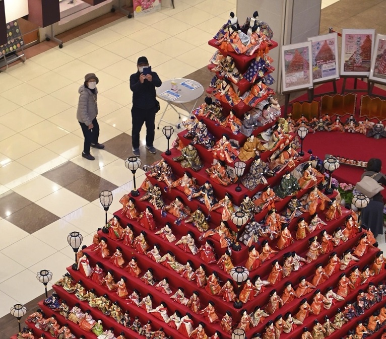 當(dāng)?shù)貢r(shí)間2月19日,日本埼玉縣鴻巢市,當(dāng)?shù)匾患屹?gòu)物中心展出女兒節(jié)人偶“金字塔”,7米高的分層陳列臺(tái)上展出約1800個(gè)娃娃。(圖片來(lái)源:東方IC)