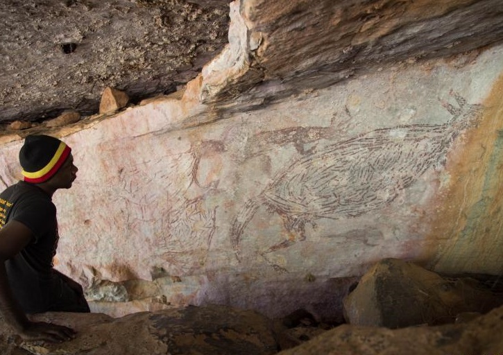這張2016年7月15日拍攝的資料照片顯示,在澳大利亞金伯利地區(qū),一名原住民觀看袋鼠巖畫(huà)。