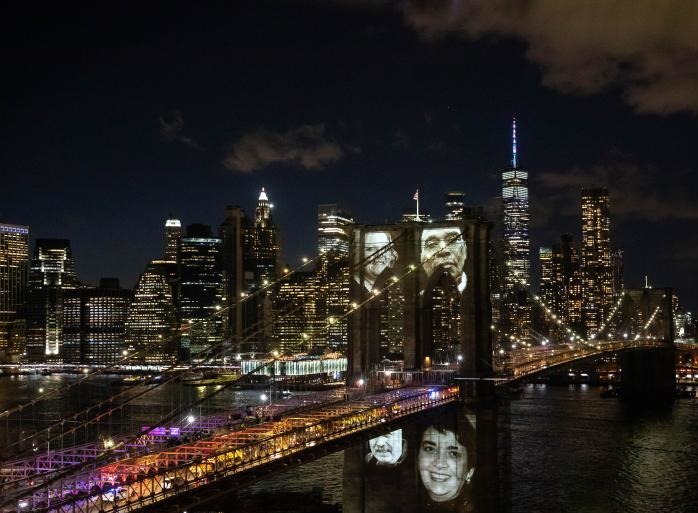 3月14日,新冠逝者的照片在紀(jì)念活動(dòng)上被投射到美國(guó)紐約布魯克林大橋上。新華社發(fā)(郭克攝)