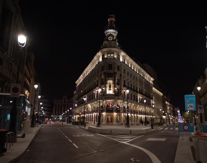 這是3月27日晚拍攝的西班牙馬德里空蕩蕩的街頭。
