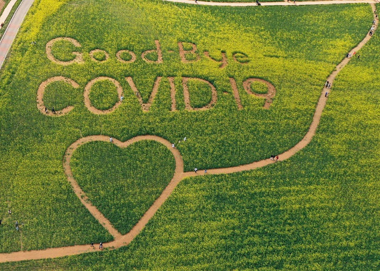 人民網(wǎng)訊 當?shù)貢r間4月18日,韓國京畿道南部安城市,航拍鏡頭記錄下當?shù)赜筒嘶ㄌ锢铩癎ood-Bye COVID-19”(新冠病毒,再見)的字樣。