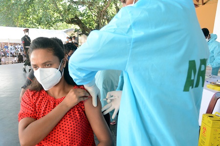 7月20日,一名女子在斯里蘭卡科倫坡接種第一劑國藥疫苗。