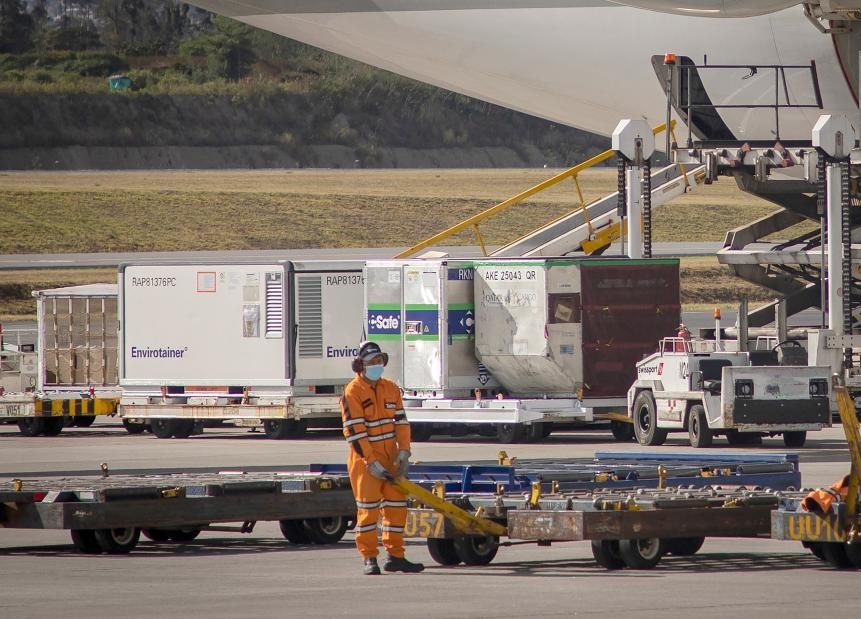 8月3日,工作人員在厄瓜多爾首都基多蘇克雷國際機(jī)場轉(zhuǎn)運(yùn)新冠疫苗。