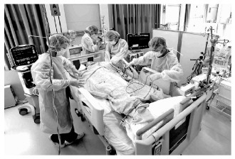 圖為日本大阪一家醫(yī)院的醫(yī)護人員治療新冠患者。 圖片來源:人民視覺