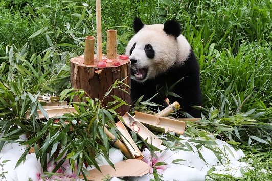 旅德大熊貓“夢(mèng)夢(mèng)”和“嬌慶”的雙胞胎幼崽“夢(mèng)想”和“夢(mèng)圓”31日迎來兩周歲生日,柏林動(dòng)物園為它們舉辦了慶祝活動(dòng)。