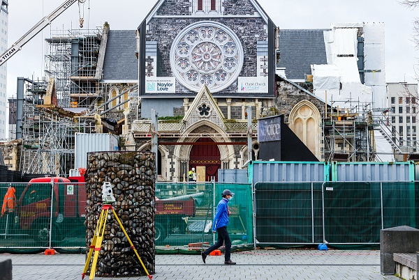 9月8日,在新西蘭南島最大城市克賴斯特徹奇,一名男子戴著口罩從維修中的大教堂前經(jīng)過。