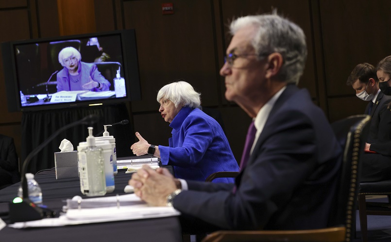 9月28日,美國財政部長耶倫(左一)在華盛頓出席國會參議院銀行、住房和城市事務委員會聽證會。