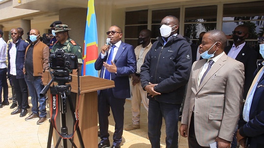 11月3日,剛果(金)南基伍省省長卡西(中)在該省首府布卡武市就當(dāng)天凌晨發(fā)生的襲擊召開新聞發(fā)布會。